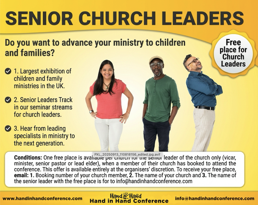 One free place is available per church for the senior leader of the church only (vicar, minister, senior pastor or elder) when a member of their church has booked to attend the conference. This offer is available entirely at the organiser’s discretion.
